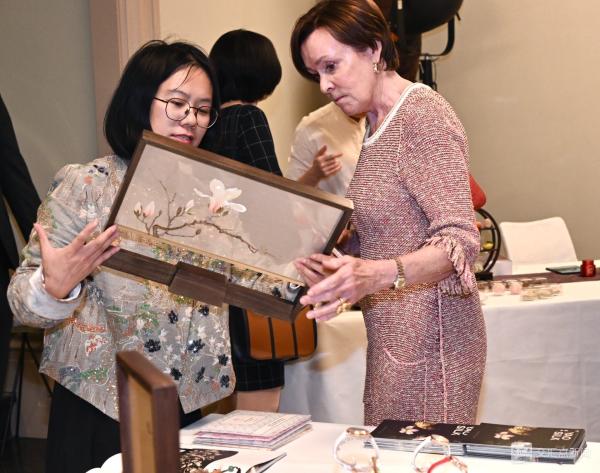 现场入口处,苏绣、剪纸、沙画、茶点茶艺等一一展示,与雕版印刷、面塑糖人等互动体验相映生辉。席间,来自无锡的民乐合奏《茉莉花》、锡剧折子戏唱段《双珠凤·枝头鸟儿》、弦乐合奏《梁祝》等相继上演,让嘉宾们在品味美食的同时,也沉浸于视觉与听觉的双重享受。尤为独特的是,现场每张餐桌均以江苏一项非遗代表性项目命名,并相应陈列着南京云锦、扬州古琴等工艺精品,让嘉宾们在品赏之余感悟中华文化的精深与雅致。每位嘉宾都获赠了一份精美的伴手礼——宜兴紫砂玉兰杯,部分嘉宾还获赠了茉莉花八音盒,将这份独特的江苏文化记忆珍存带回。