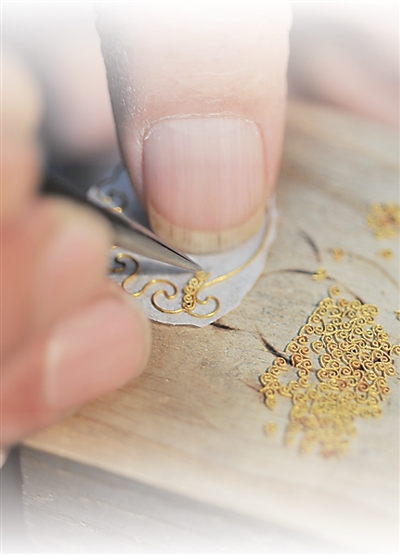 花丝工艺中的掐丝填丝步骤。 潘妙 供图
