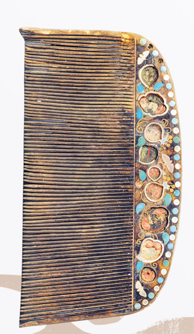 甘肃武威市博物馆藏唐镶螺钿绿松石八宝纹骨梳。侯雅丹 摄