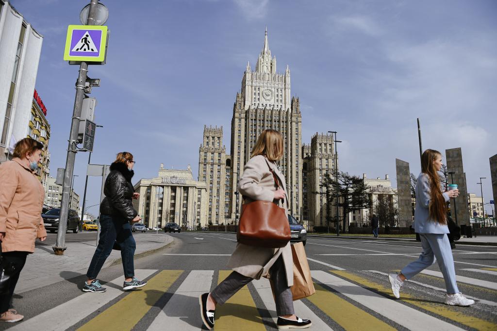 2021年4月16日,在俄罗斯首都莫斯科,行人从俄罗斯外交部大楼附近走过。