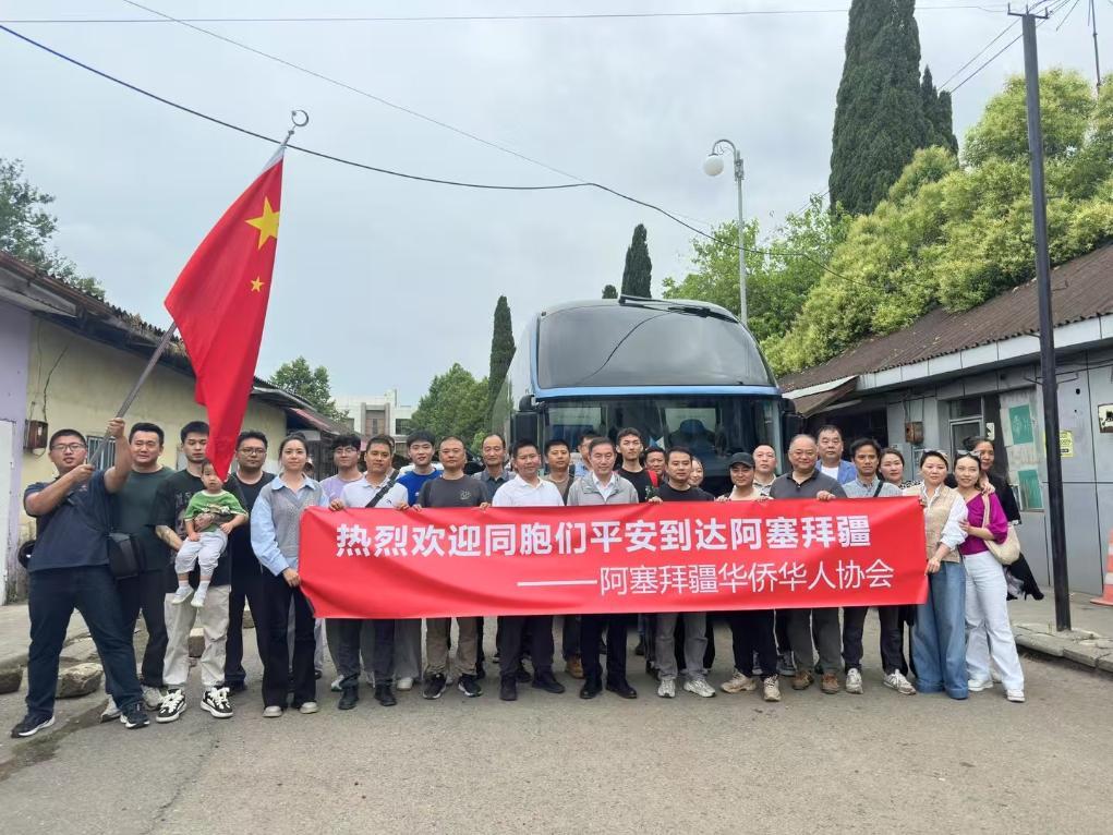 6月17日,从伊朗经阿斯塔拉陆路口岸撤入阿塞拜疆境内的中国公民与前来接应的中国驻阿塞拜疆使馆工作人员及阿塞拜疆华侨华人协会代表在阿斯塔拉口岸合影留念(手机照片)。