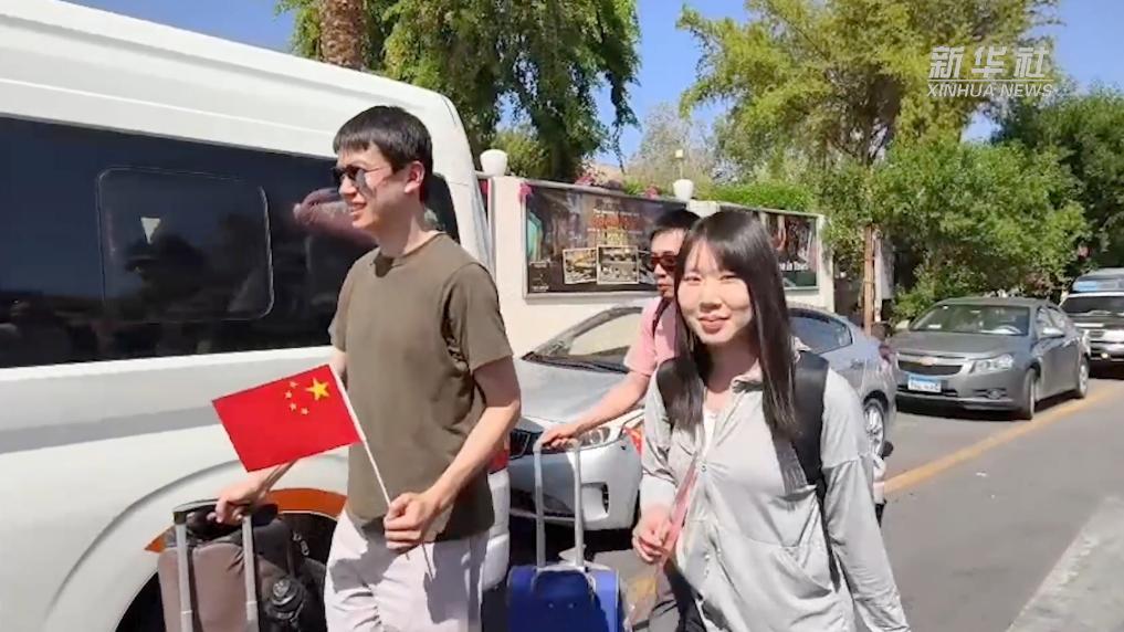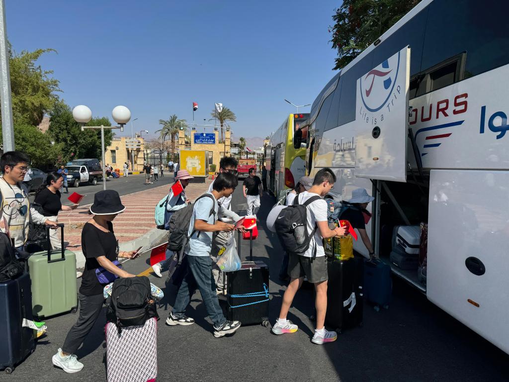 6月19日,在埃及南西奈省塔巴口岸,从以色列撤离的中国公民准备乘车离开。