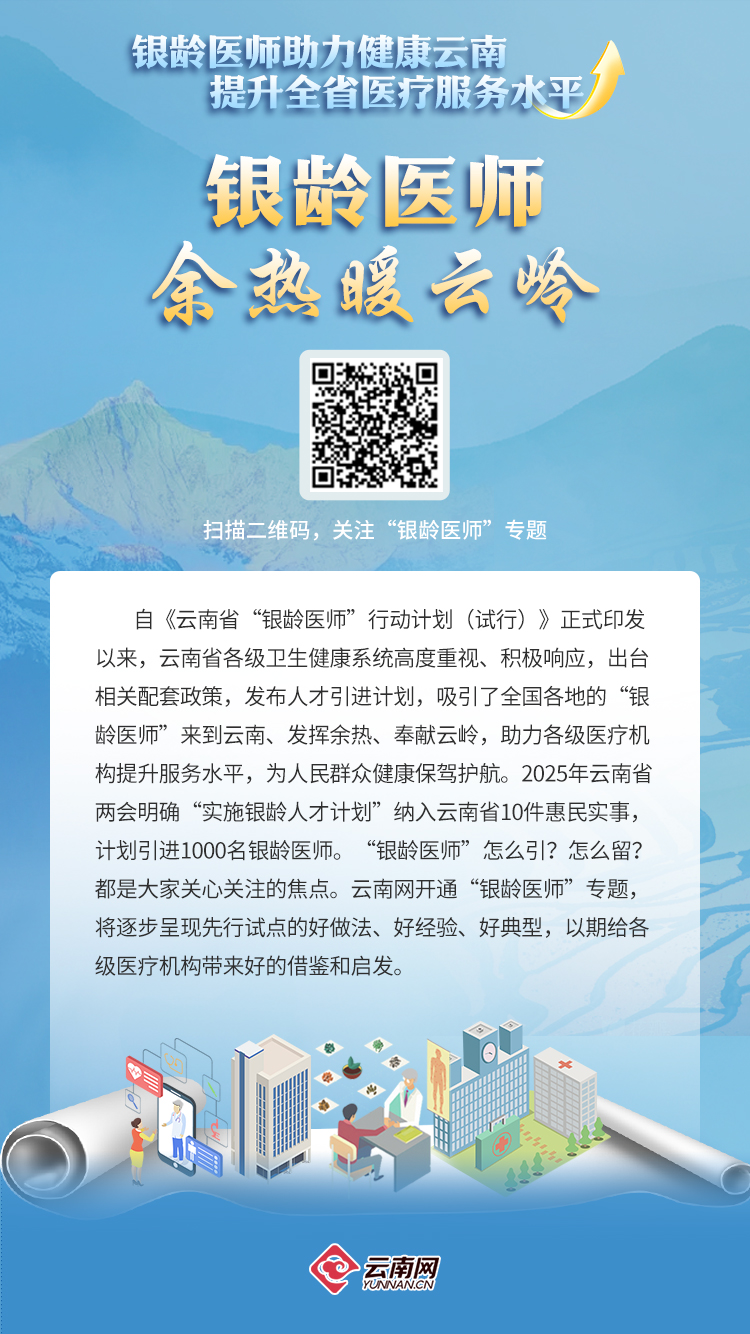 【导语】自《云南省“银龄医师”行动计划(试行)》正式印发以来,云南省各级卫生健康系统高度重视、积极响应,出台相关配套政策,发布人才引进计划,吸引了全国各地的“银龄医师”奉献云岭、发挥余热,助力各级医疗机构提升服务水平,为人民群众健康保驾护航。2025年云南省两会明确“实施银龄人才计划”纳入云南省10件惠民实事,计划引进1000名银龄医师。“银龄医师”怎么引?怎么用?怎么留?都是大家关心关注的焦点。2025年4月,云南网联合云南省人口和卫生健康宣传教育中心第二次出发,奔赴红河哈尼族彝族自治州、文山壮族苗族自治州,了解“银龄医师”行动计划在当地推行的情况。