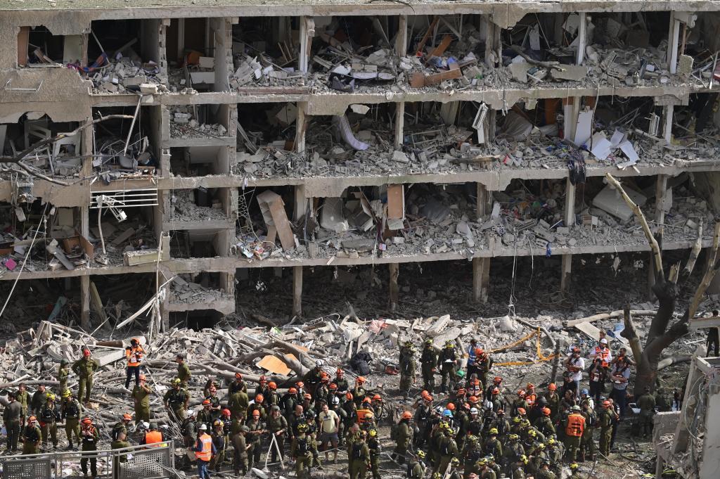 6月22日,在以色列中部特拉维夫的导弹袭击现场,应急和救援人员开展工作。