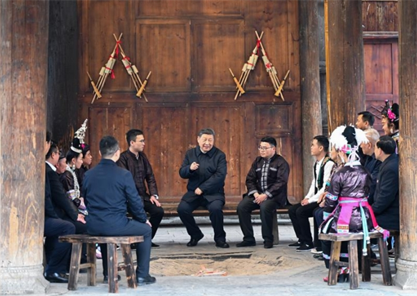 今年3月,习近平总书记来到这里考察时,同乡亲们围坐在一起,召开了一场别开生面的“板凳座谈会”。大家争相向总书记讲述近年来的村寨变化和幸福生活。习近平总书记高兴地说,从你们的讲述、你们的神情可以看出,村寨这些年欣欣向荣。
