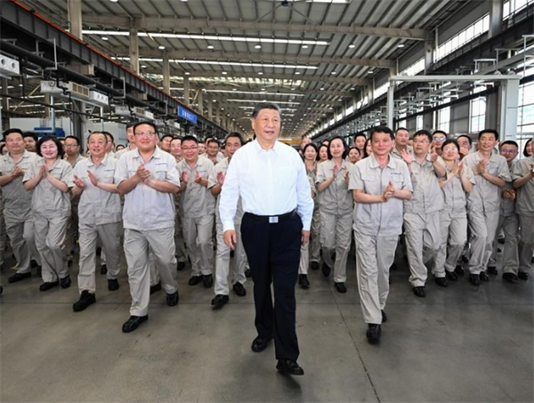 △2025年5月19日,习近平总书记在河南洛阳轴承集团股份有限公司智能工厂考察时,同企业职工在一起。