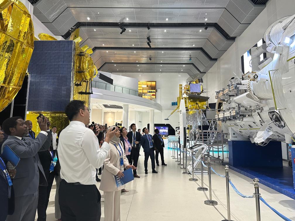 空间站核心舱等比例模型、神舟十七号返回舱实物、嫦娥五号带回的月球样品……在中国空间技术研究院展示中心内,珍贵的展示品激发使节们深厚的探索兴趣。他们驻足观看,详尽了解中国在载人航天、深空探测和各类应用卫星等领域的辉煌成就,更通过零距离“触摸”,直观感受中国航天事业坚实的发展进程。