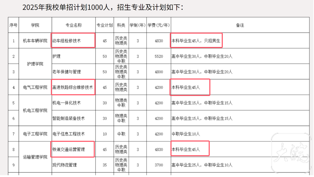 大皖新闻记者注意到,在《郑州铁路职业技术学院2025年单独考试招生章程》中,有三个专业的备注栏注明“本科毕业生”。这三个专业分别是动车组检修技术、高速铁路综合维修技术、铁道交通运营管理。三个专业的招生计划都是45人,其中动车组检修技术专业备注“只招男生”。