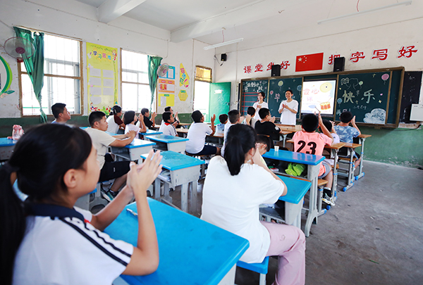 16位同学发挥师范、音乐等专业优势,结合罗坊中心小学师生实际情况,设计了丰富多彩的暑期支教内容,特别是通过美育教育提升他们的综合素养。比如,音乐专业的同学们创新编排,将课本上所学的古诗词与音乐相结合,把陆游、孟浩然的古诗唱出来、舞起来,以文艺的方式从小坚定青少年的文化自信。支教课程不仅受到罗坊中心小学师生、家长的欢迎,周围一些乡村的家长也纷纷把孩子送来参加。