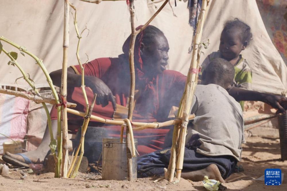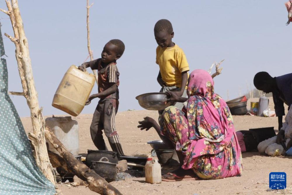 7月9日,妇女和儿童在苏丹北达尔富尔州法希尔一处流离失所者营地做饭。