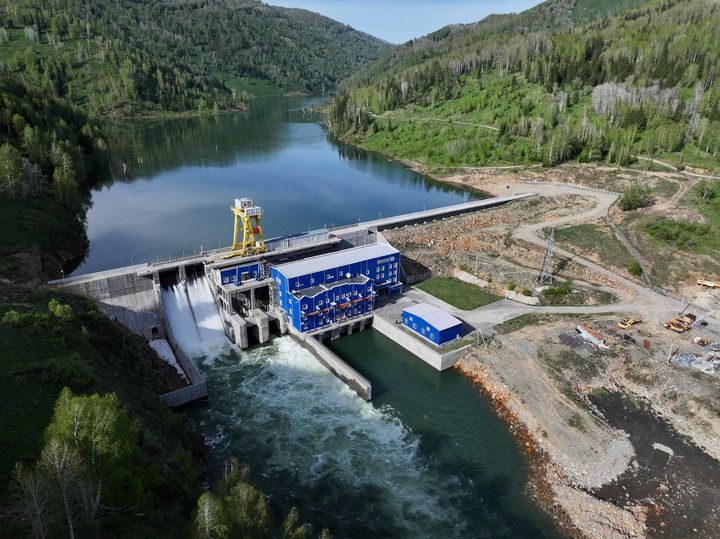这是2025年5月8日在哈萨克斯坦东哈州拍摄的图尔古孙水电站(无人机照片)。新华社记者 李任滋 摄