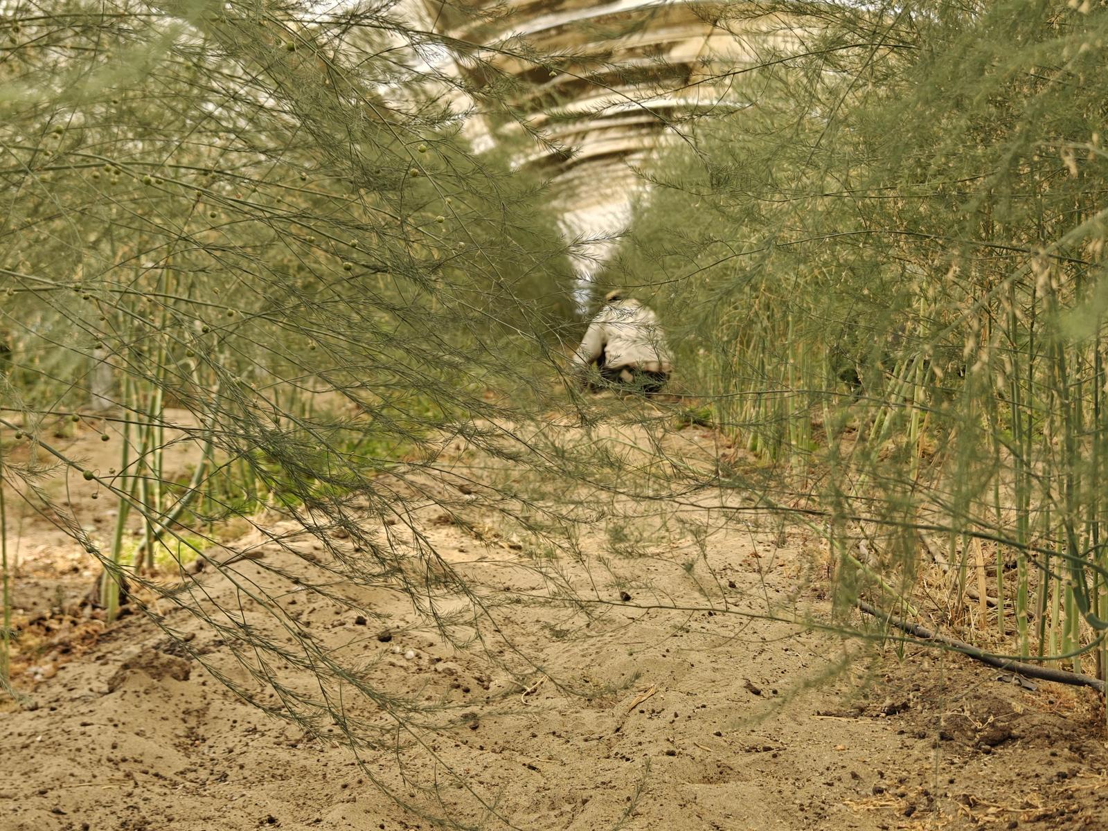 大棚下的细沙地里,嫩绿色的芦笋已经有拇指般粗细,正直挺挺地探出头,等待工人采收。
