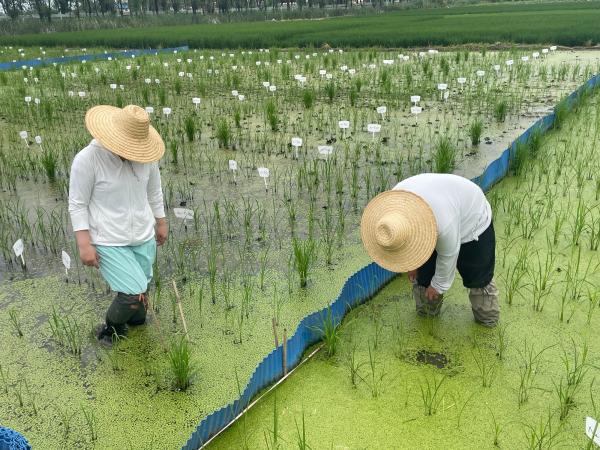 天津农学院学生在小站稻试验田中工作(央广网发 天津农学院供图)