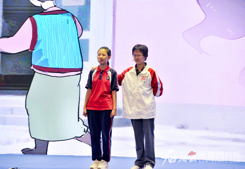 7月22日,来自阿图什市谢依特小学戍边支教西部计划志愿者服务队队员廖佳丽与学生迪丽胡玛尔·托力干在2025年新疆网络文明大会上做主旨演讲。石榴云/新疆日报记者 王禹摄