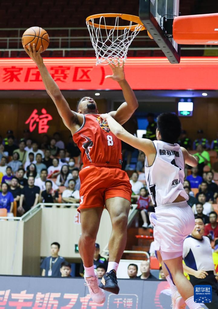 7月22日,石家庄翔蓝队球员阿诺斯克(左)在比赛中上篮。