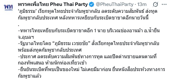 泰国执政党为泰党23日发布声明表示,一名泰国士兵当天在泰柬边境触发地雷而受伤,泰方因而决定降低双方的外交关系等级。按照泰国外交部的说法,致泰国士兵受伤的地雷系柬方新布设,泰方已就此向柬方提出正式抗议。