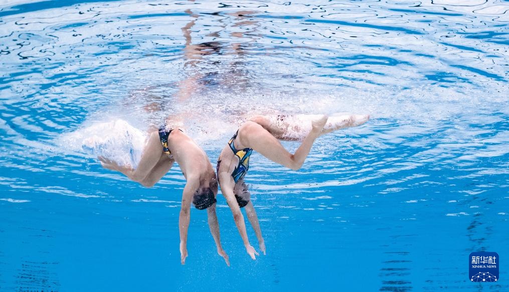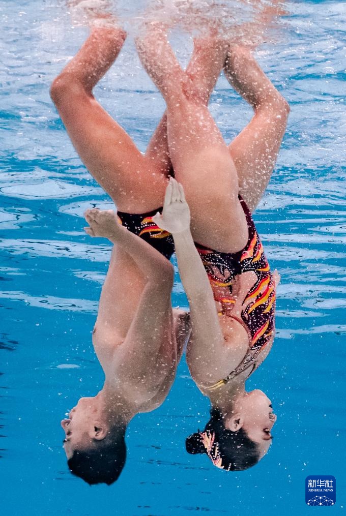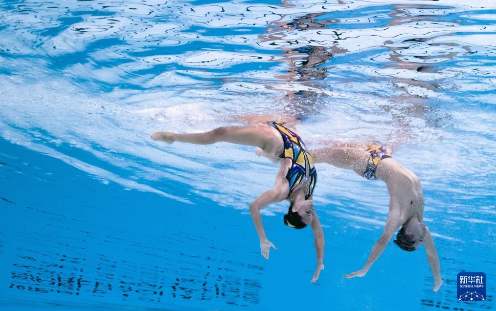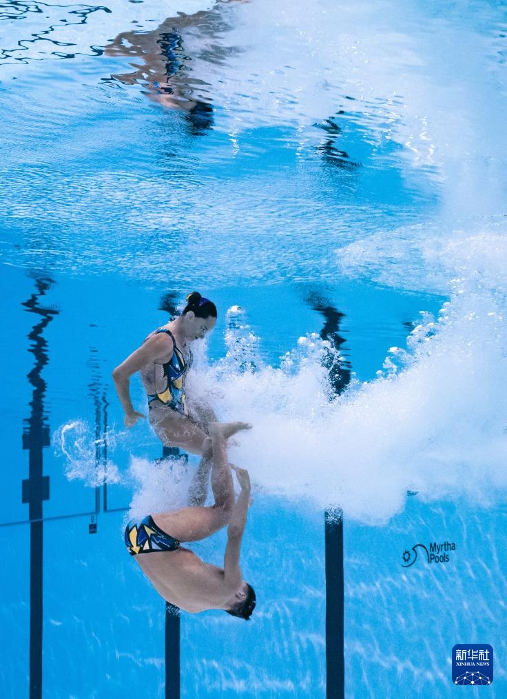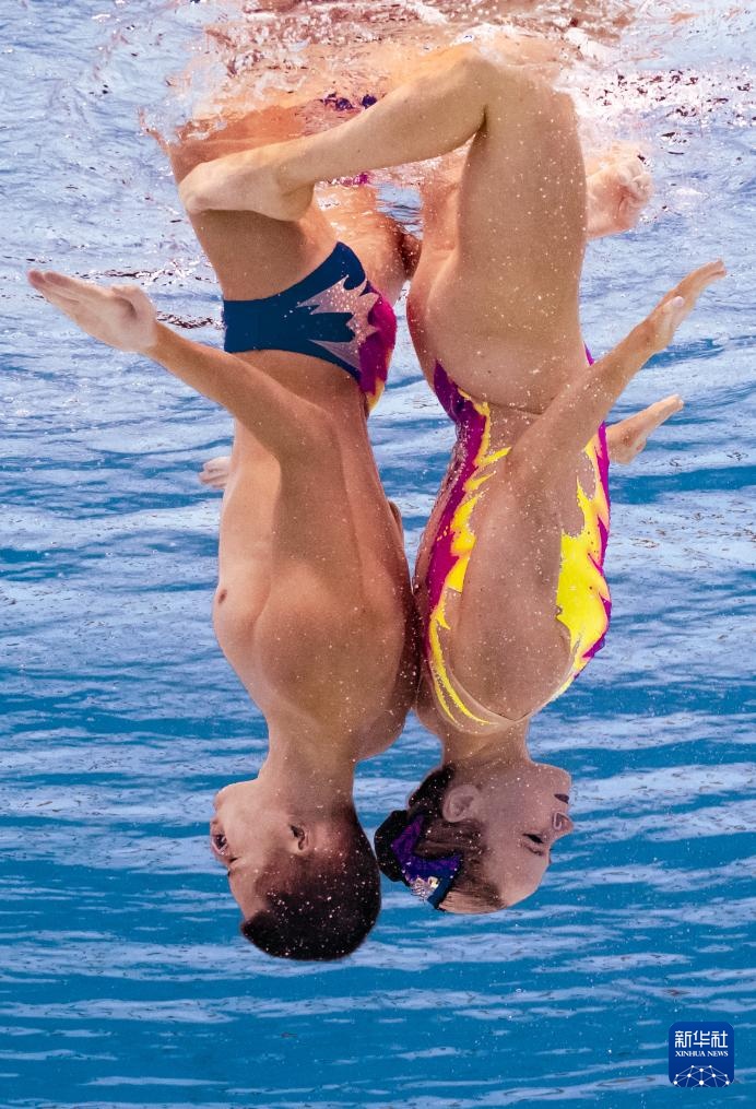 7月23日,中国组合郭牧也/郭思彤在比赛中。最终,他们位列第六(照片翻转180度)。新华社记者 夏一方 摄