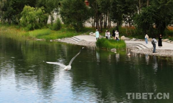 图为拉萨两岛内河绿色生态廊道一隅,成群的水鸟在河边栖息 摄影:刘莉
