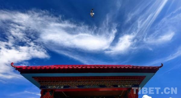 图为拉萨两岛内河绿色生态廊道一隅,水鸟在天空中飞过 摄影:刘莉