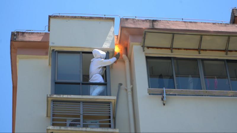消防救援人员到达现场后发现,蜂窝直径约30厘米,位于六楼外墙夹缝,距离窗户不足一米,数十只马蜂在周边盘旋。一名消防员身着防蜂服、携带杀虫剂从窗户靠近蜂窝。因周边无易燃物,消防员采用火烧方式摘除蜂窝,随后用铁锹彻底清理残余蜂巢并喷洒杀虫剂,成功消除隐患。