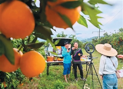 为了拼销路,这个戴眼镜的斯文小伙儿,在村子的果园里表演“生吞血橙”,一口咬下,汁水四溢,效果十足,整场直播下单量超200单。他还和临近村庄的驻村干部组成“书记主播团”,大家一道与快递公司洽谈,入村点位变多,物流更快了。