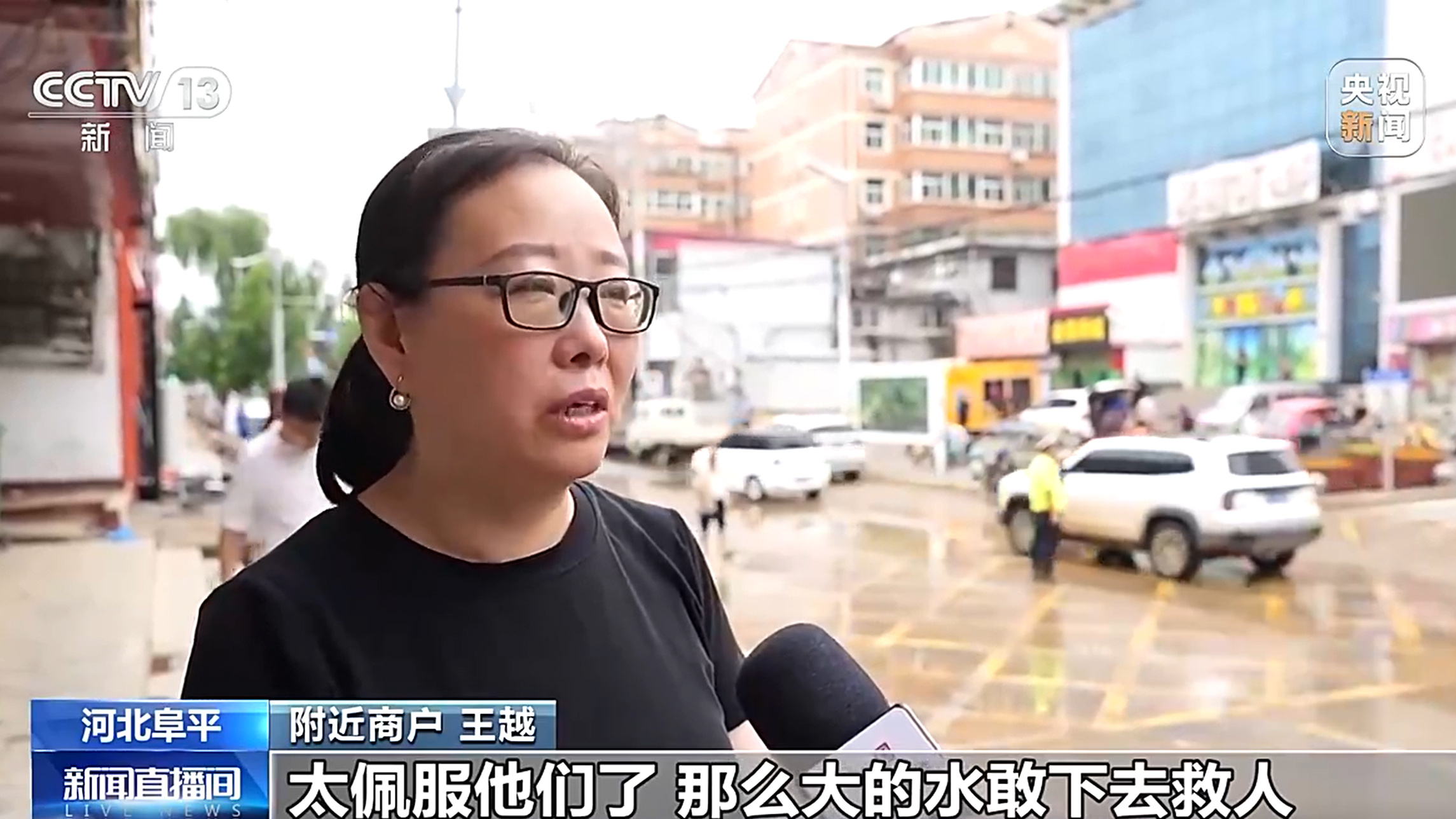 附近商户 王越:当时那个孩子一直哭着喊他爸爸,把孩子吓坏了。我太佩服他们了,那么大的水敢下去救人,给他们竖个大拇指。