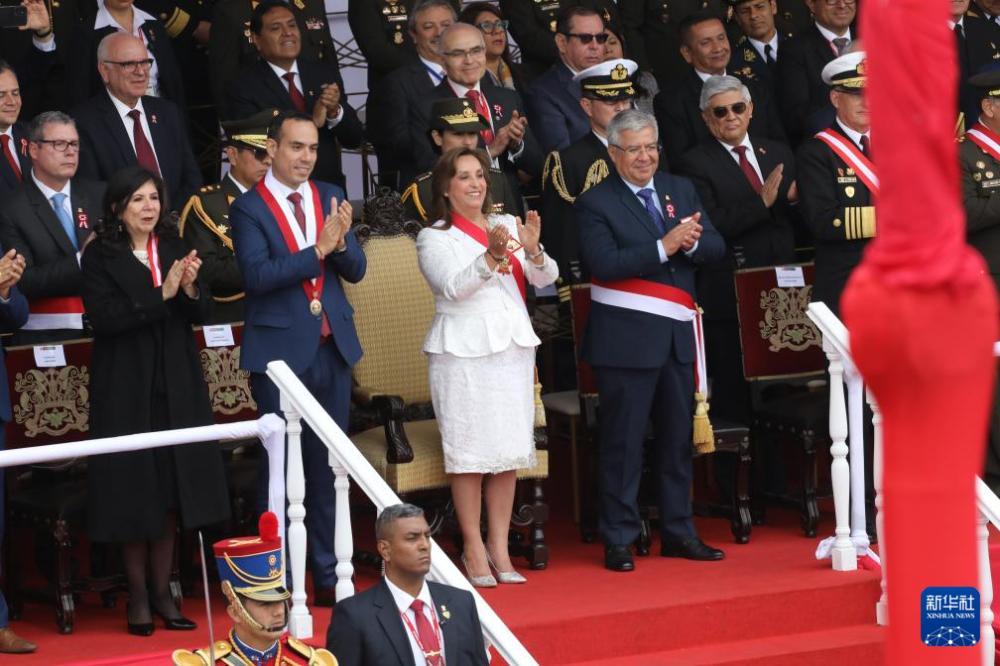 7月29日,秘鲁总统博鲁阿尔特(中)在秘鲁首都利马出席独立日阅兵式。7月28日是秘鲁独立204周年纪念日。