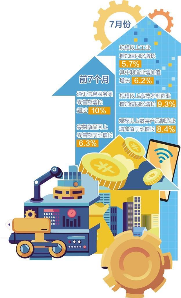 数智化转型稳步推进。在信息化和智能化大潮推动下,数字产品制造、智能产品生产发展向好,7月份规模以上数字产品制造业增加值同比增长8.4%,持续快于规模以上工业增速。其中智能设备制造、电子元器件及设备制造分别增长13.4%和11%。人工智能应用快速推进,相关行业发展向好,7月份工业机器人、服务机器人产量分别增长24%、12.8%。