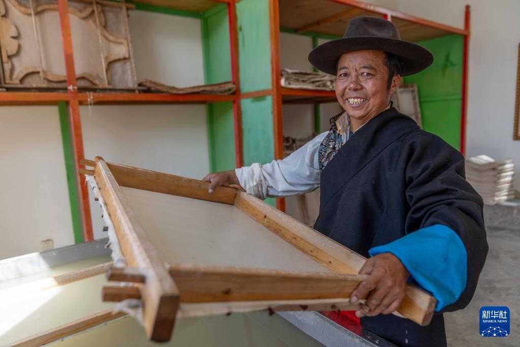 8月12日,雪拉藏纸制作技艺自治区级代表性传承人格桑旦增在制作藏纸。新华社记者 旦增尼玛曲珠 摄