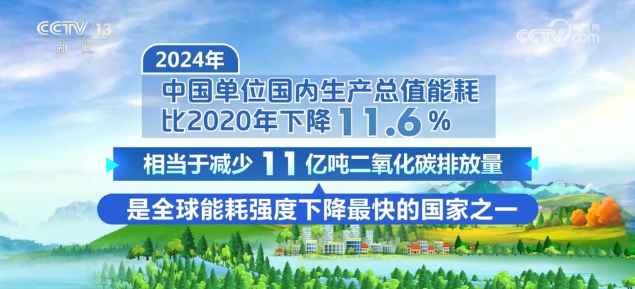 2024年,中国单位国内生产总值能耗比2020年下降11.6%,相当于减少11亿吨二氧化碳排放量,是全球能耗强度下降最快的国家之一。