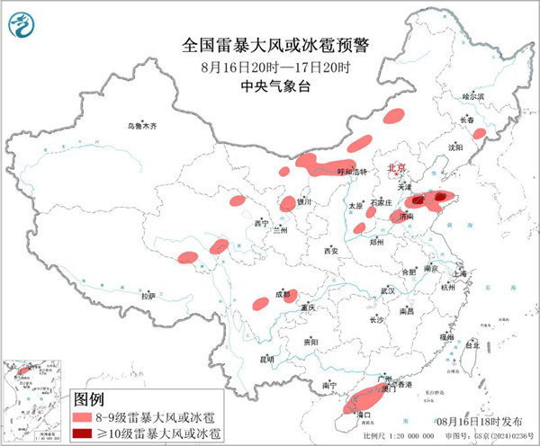今天夜间到明天,内蒙古中部和西部、西北地区中部、华北南部、黄淮北部、西南地区东部等地部分地区将有8级以上雷暴大风或冰雹天气,其中,山东北部和东部等地的部分地区将有10级以上雷暴大风。