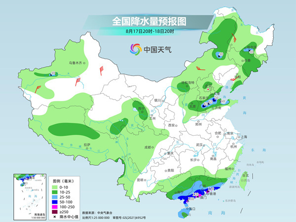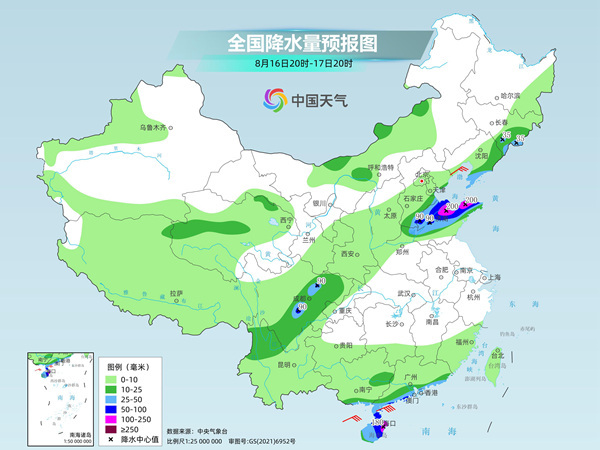 在副热带高压边缘,是降雨集中的地方,海南、云南一直到山西、河北、辽宁等地出现西南至东北走向的降雨带。