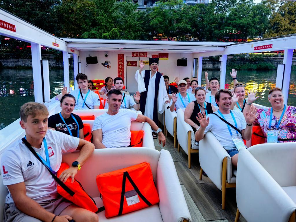 8月6日,前来参加成都世运会的运动员和教练乘游船游览锦江。