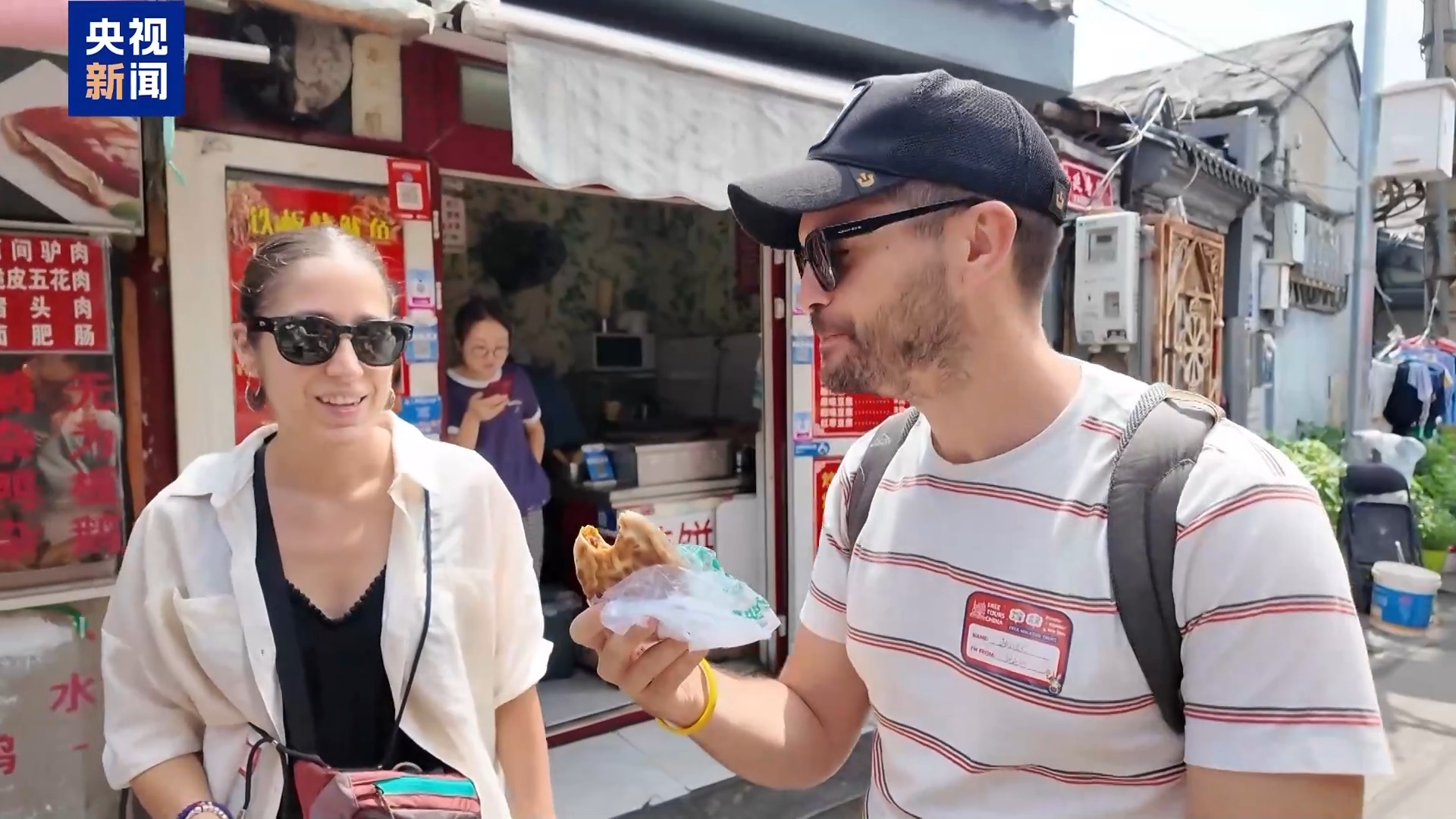 中午时分,外国游客们就在胡同里体验馅饼等各种小吃,美食也加深了大家对中国的喜爱。