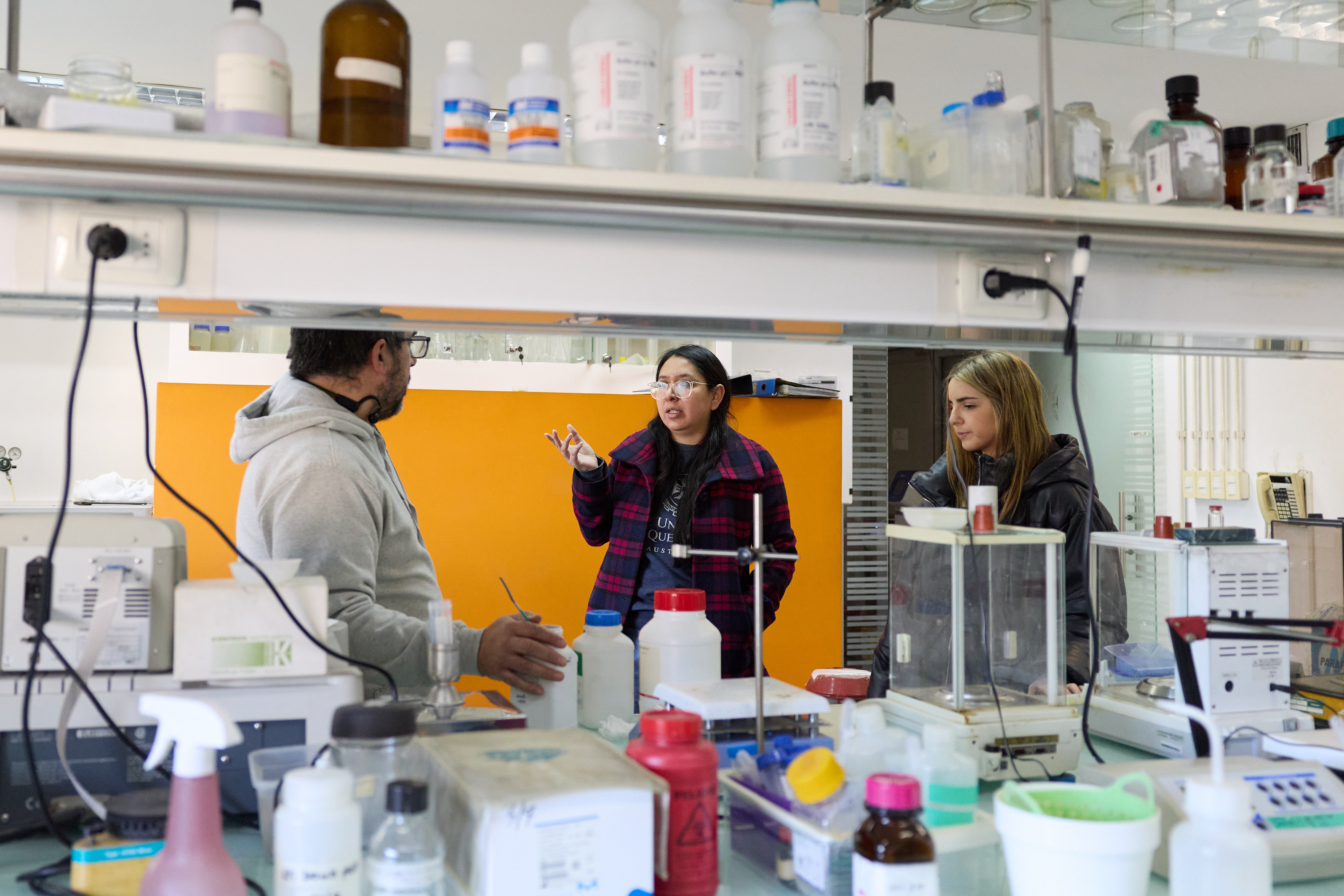 6月26日,在乌拉圭蒙得维的亚,研究人员在中国-乌拉圭生物纳米制药联合实验室内讨论。(