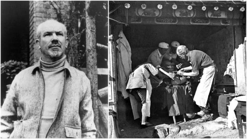 左图是白求恩,右图是白求恩在晋察冀边区涞源县临时手术室里为伤员做手术。