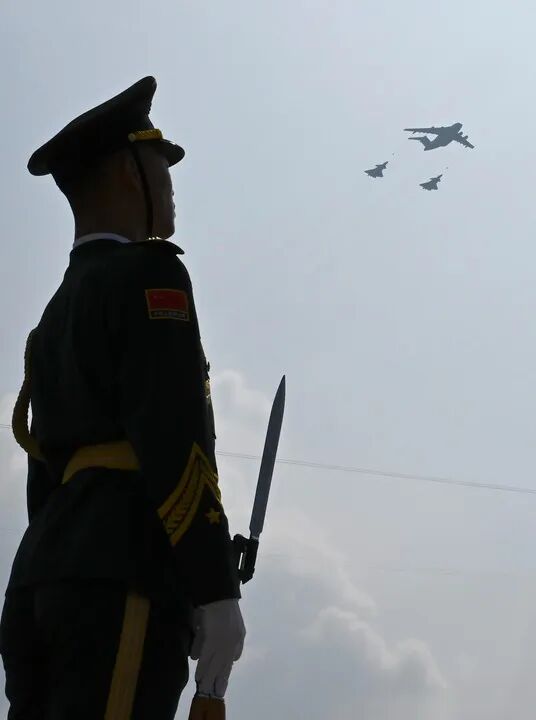 这是空中护旗梯队从反舰导弹方队上空飞过。新华社记者 林煜 摄