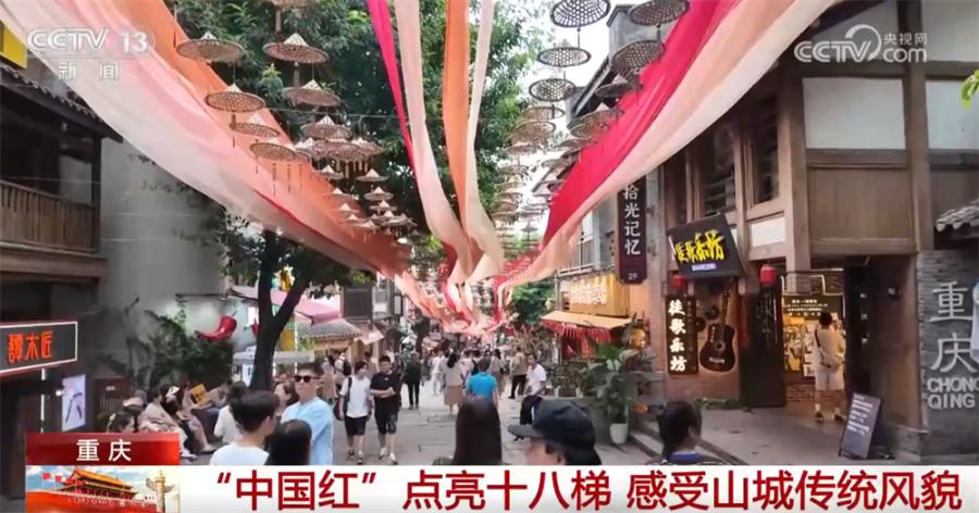 重庆市渝中区的十八梯传统风貌区在国庆假期挂起了鲜艳的五星红旗。主街上空,四百米长的草帽长街披上了流动的红色长纱,整条街被这抹“中国红”点亮。人们穿梭在古色古香的建筑间,感受山城错落立体的独特地貌。10月1日,预计这里将接待游客超过10万人次。