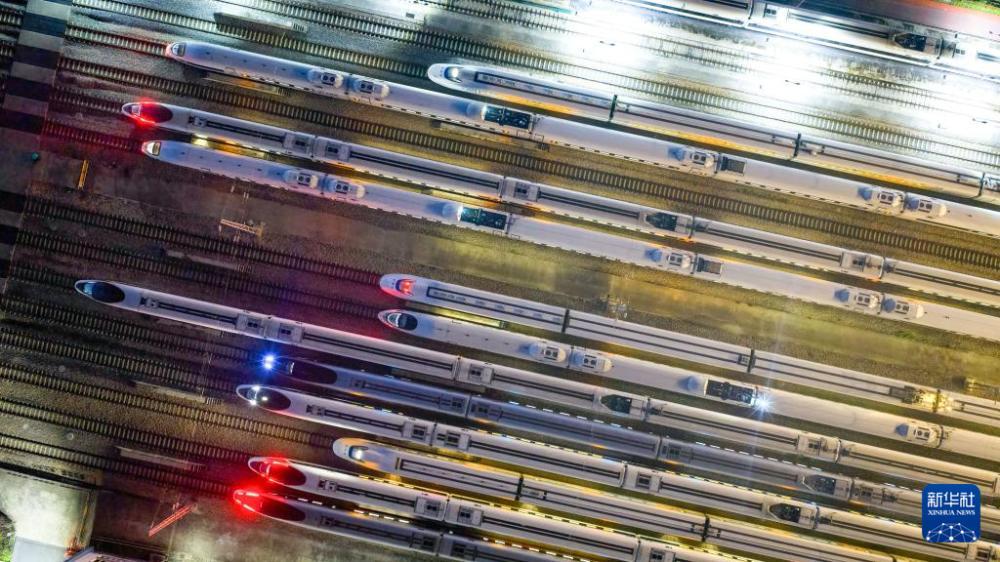 10月10日拍摄的停靠在南京动车段南京南动车运用所存车线上的列车(无人机照片)。