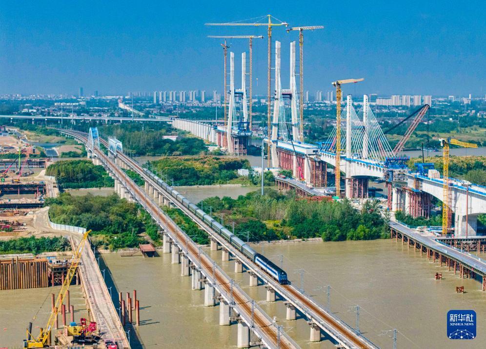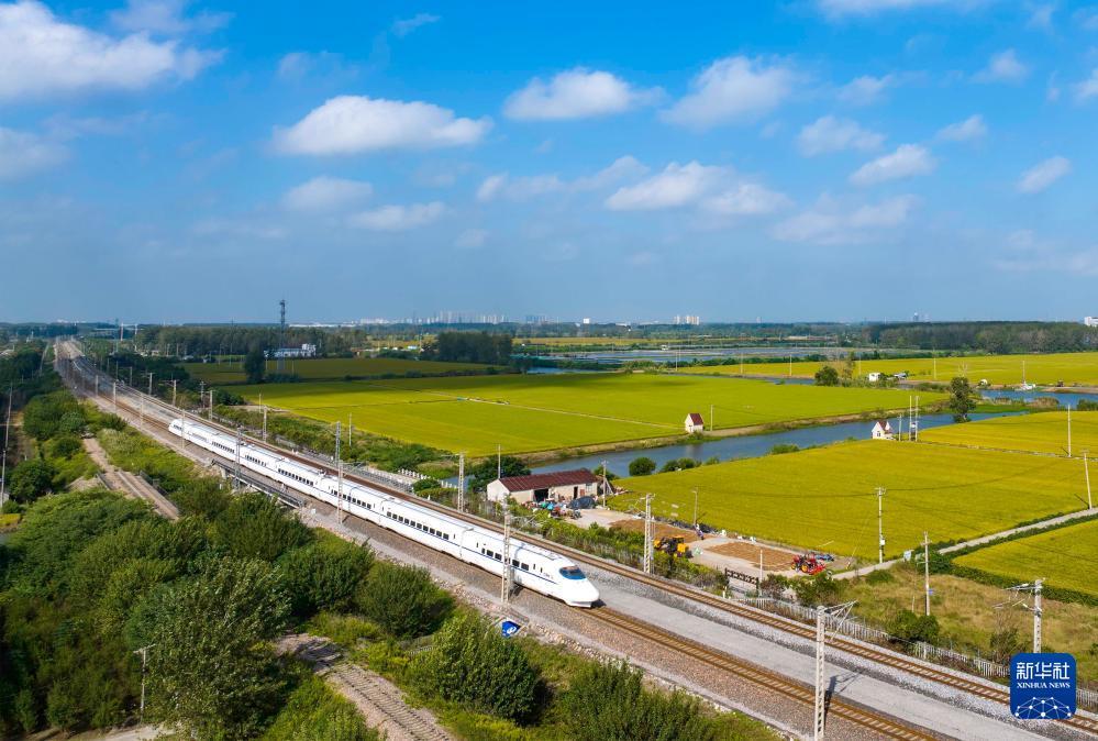 10月10日,列车行驶在宁启铁路江苏扬州段(无人机照片)。