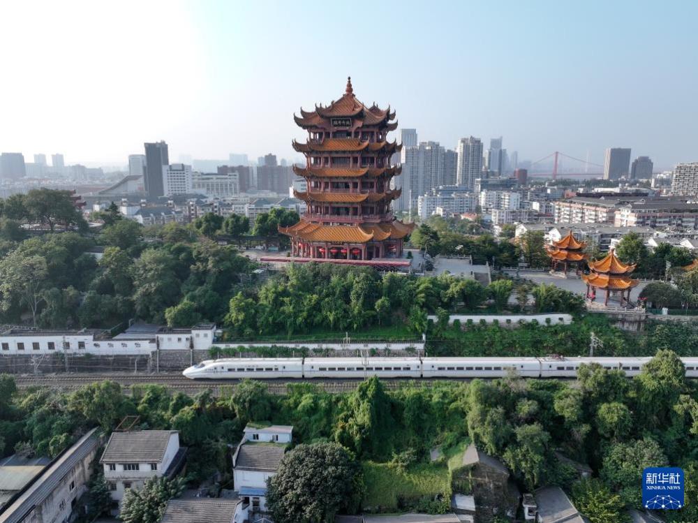10月10日,动车组列车经过湖北省武汉市黄鹤楼(无人机照片)。