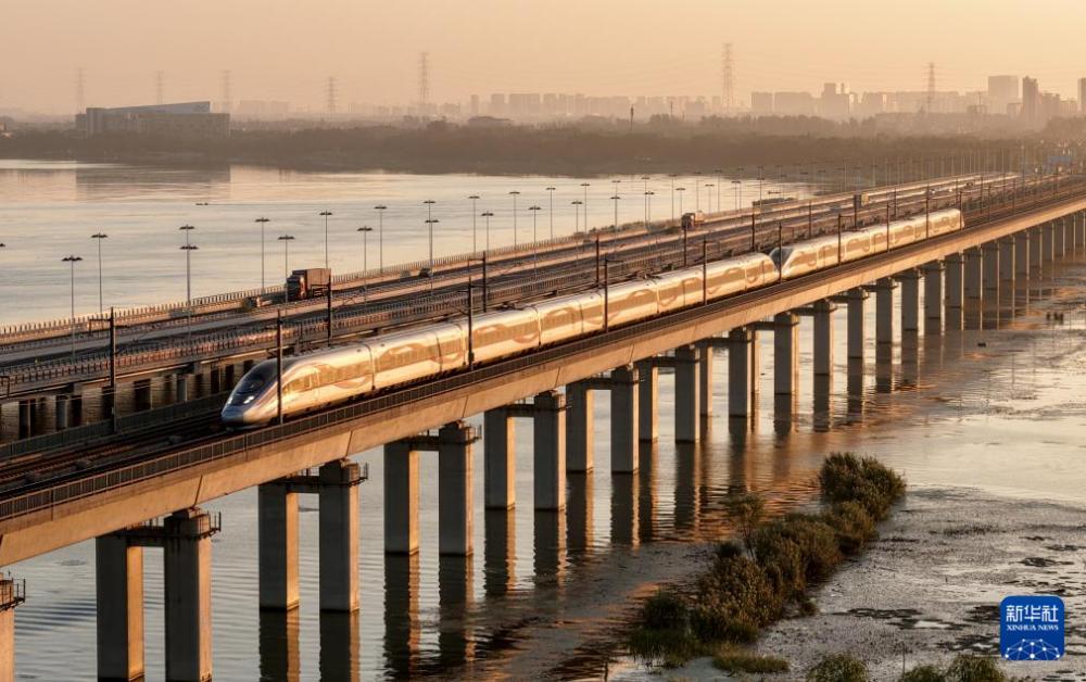 10月10日,在江苏省昆山市,动车组列车通过京沪高铁丹昆特大桥阳澄湖段(无人机照片)。