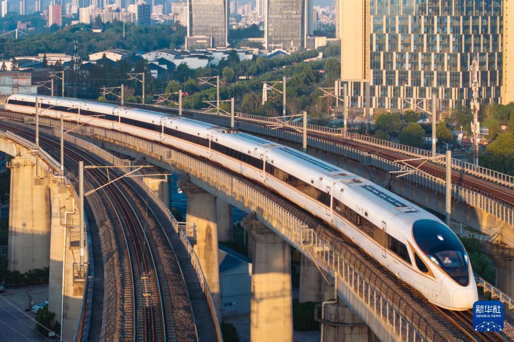 10月10日,动车组列车驶出南京动车段南京南动车运用所(无人机照片)。