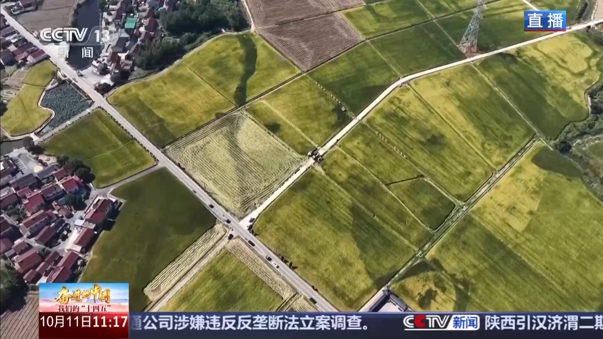 总台央视记者 田琪永:我现在所在的位置是安徽省广德市誓节镇红应村的万亩水稻示范区。我身后是一片金黄的稻田,收割机正开足马力,在田间穿梭收获水稻。另一边,技术人员正在现场测产,科学选点、测量穗数、粒数、千粒重,就能在收割完成之前,相对准确地测量出这块田的产量。我们先从这片稻田开始,看看这里为了水稻单产提升,做了哪些准备工作。