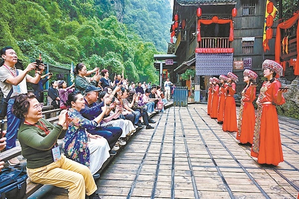游客在三峡人家景区观看土家族婚俗表演。 刘康 摄