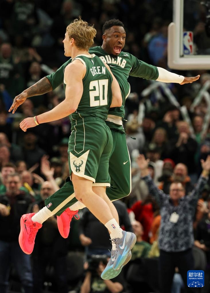 12月3日,雄鹿队球员格林(前)与队友安特托昆博在比赛中庆祝。