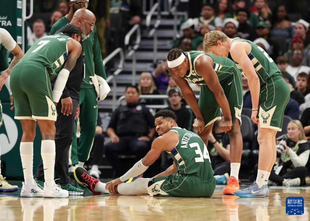 12月3日,雄鹿队球员安特托昆博(中)在比赛中受伤。