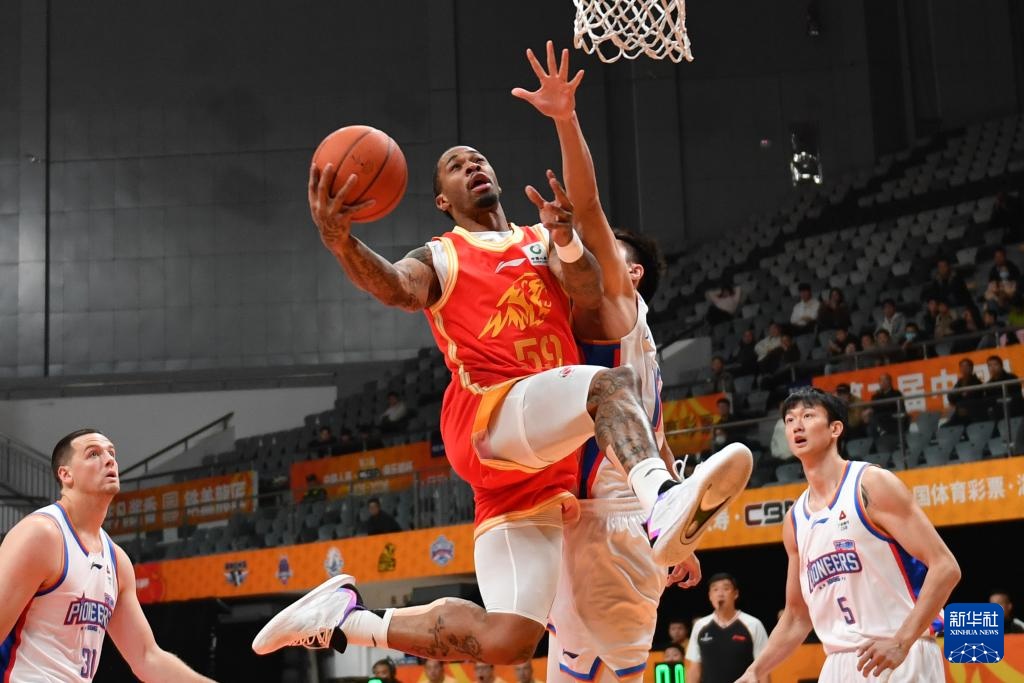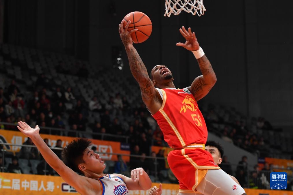 12月4日,浙江方兴渡队球员桑普森(右一)在比赛中上篮。