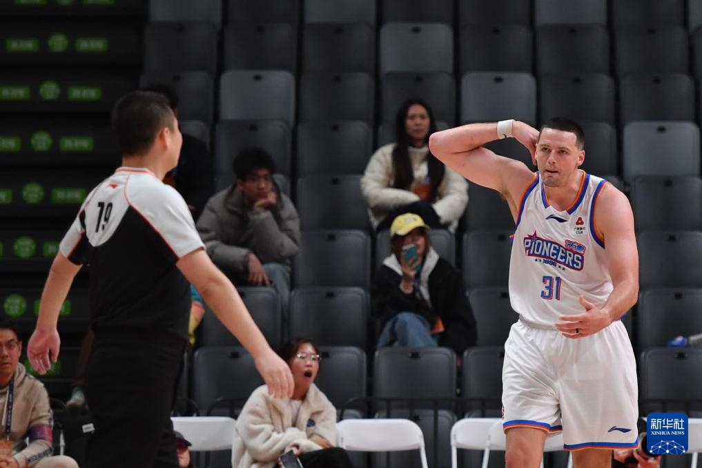 12月4日,天津先行者队球员詹姆斯在比赛中和主裁判袁宁鹏交流。