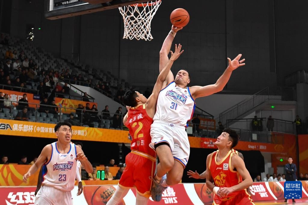 12月4日,天津先行者队球员詹姆斯(右二)在比赛中上篮。
